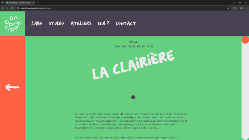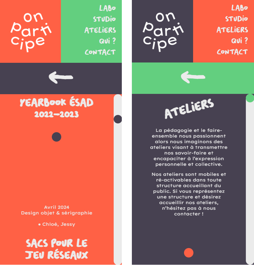 Le site web du Collectif On participe répond à un besoin de mettre en valeur une identité visuelle ludique et d’identifier leurs différentes pratiques à travers une charte colorée audacieuse. Ainsi, les couleurs du site changent en fonction de la section dans laquelle on navigue. Les éléments de navigation comme la barre de défilement ont également été personnalisés pour s’adapter à l’aspect général du site.