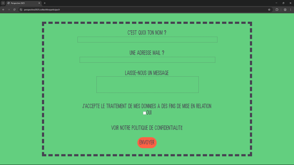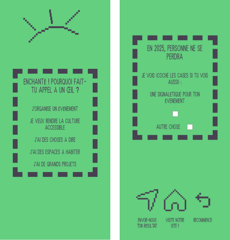 Conçu à l'attention du réseau et du public du Collectif On participe, cet outil de « Service Avant-Vente » permet de valoriser leurs compétences et de proposer des offres personnalisées. Il prend la forme d’un formulaire de contact interactif proposant une expérience narrative légère. Cette expérience en ligne a été motivée par l'envie de créer un outil facilitant la prise de contact et les nouvelles collaborations.