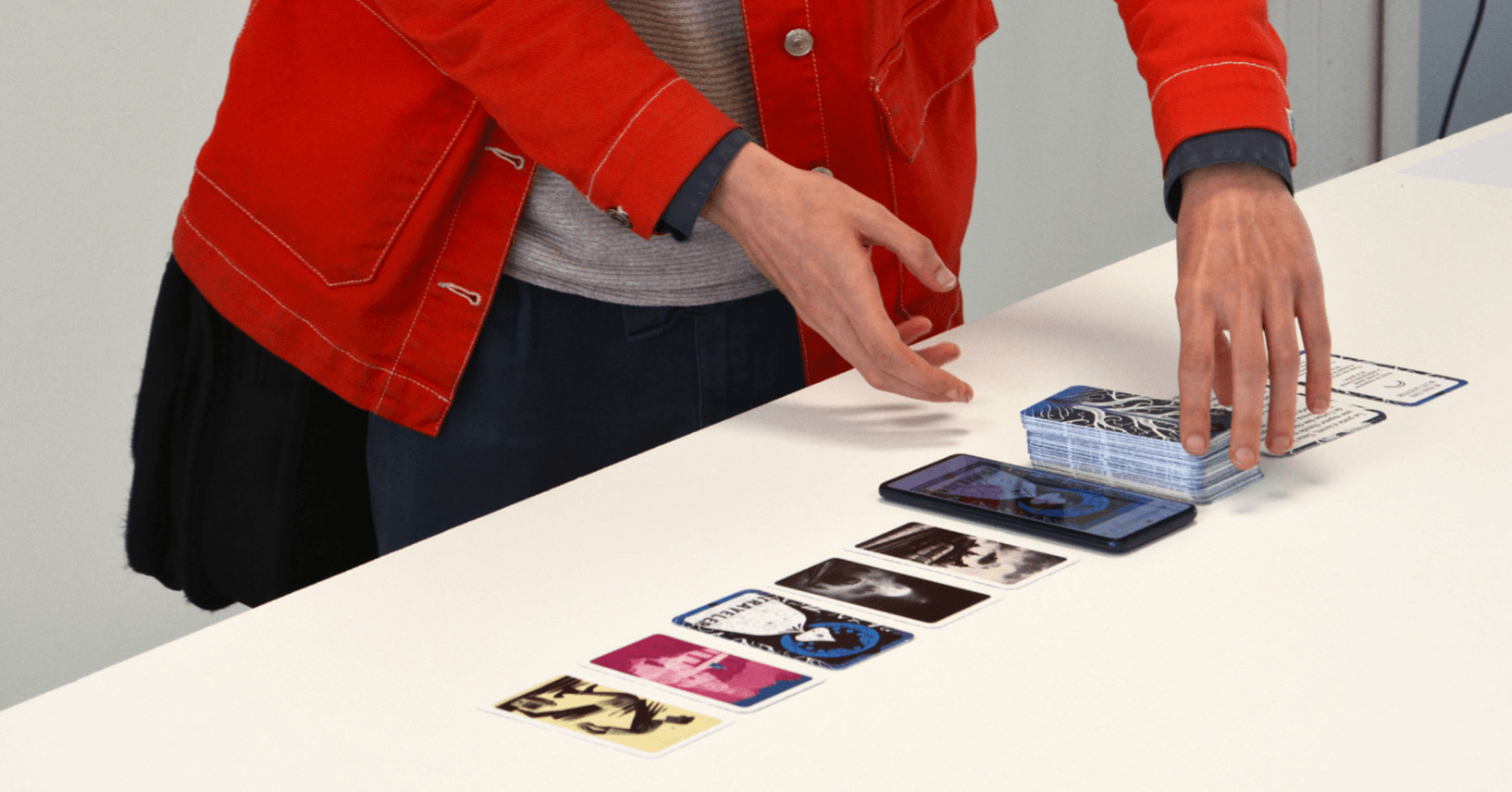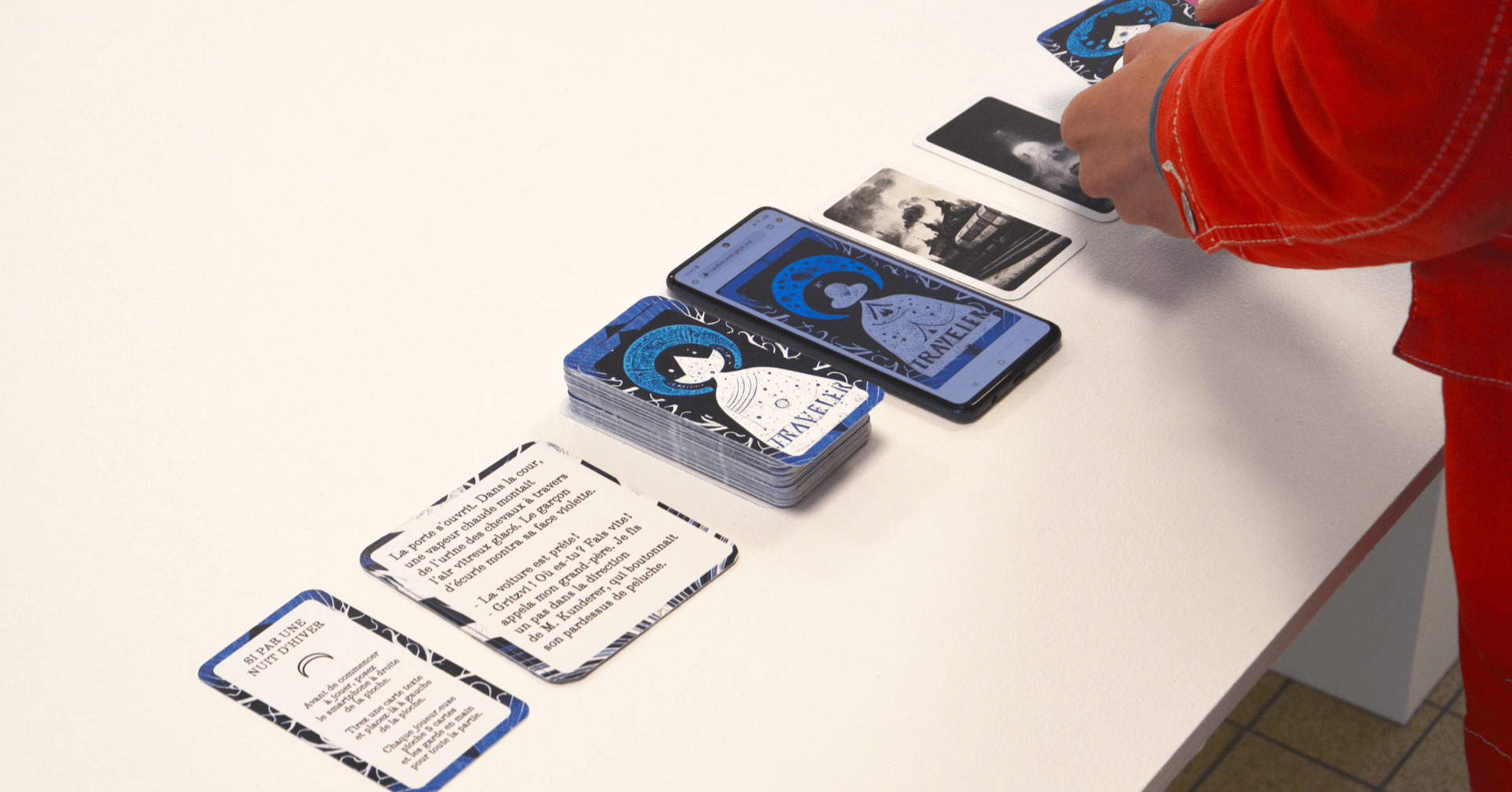 Si par une nuit d’hiver se présente sous la forme de cartes à raconter aux visuels générés par un programme d’intelligence artificielle. Reprenant la suite des incipits de l’ouvrage éponyme d’Italo Calvino, le jeu invite les joueur.euse.s à poser chacun leur tour les cartes de leur jeu et à raconter le prolongement des histoires interrompues par l’auteur dans son livre. Lors de la partie, l’IA est convoquée de nouveau par la figure du/de la voyageur·euse, permettant de faire bifurquer le cours du récit en générant une carte unique.