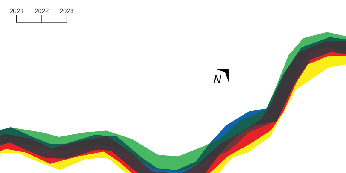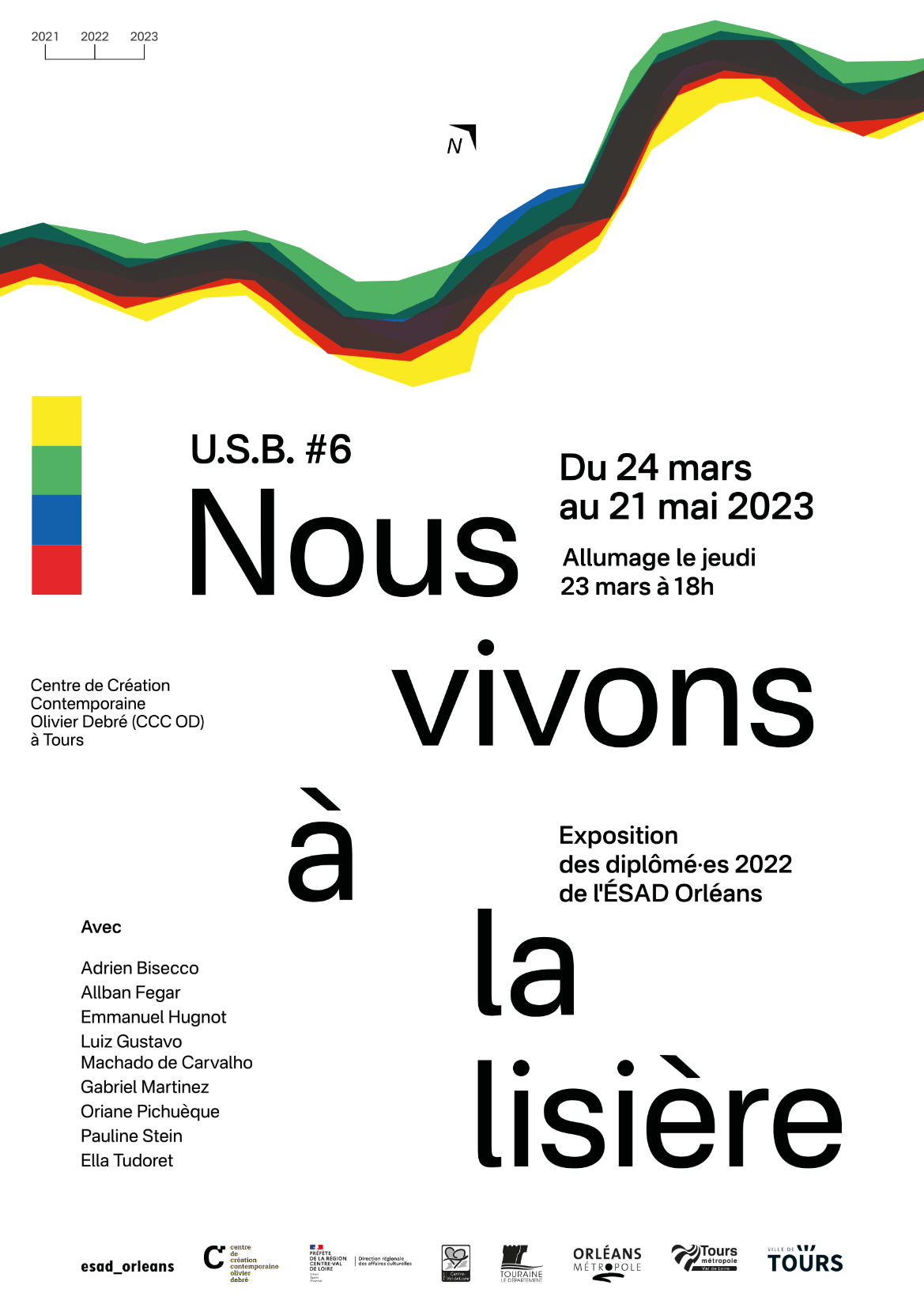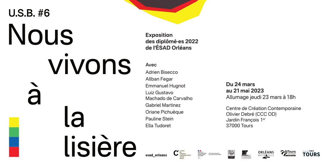 Une identité visuelle pour l’exposition des jeunes diplômé.e.s de l’ESAD Orléans nommée U.S.B #6, présentée du 24 mars au 21 mai 2023 au CCC OD à Tours. Cette identité est basée sur le travail de conception graphique de Nicolas Lemaitre pour l’identité visuelle annuelle des exposition de l’ESAD Orléans pour l’année 2022-2023. Le thème coloré, fait de quatre couleurs chacune associée aux programmes de recherche de l’école, est réutilisé dans un signe faisant écho au titre de l’exposition et divisant les supports en deux parties distinctes. L’identité se présente comme une géographie dans laquelle viennent circuler les éléments typographiques, comme cheminant vers cette limite colorée, représentant ainsi la sortie de l’école vers le monde professionnel.